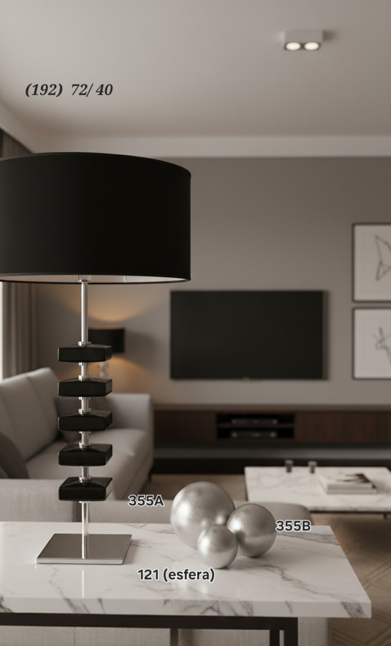 La Luminaria Tótem Elegance (Modelo 192 M) es una imponente lámpara de mesa que fusiona el diseño geométrico con la sofisticación. Su base es una plataforma cuadrada y pulida de metal cromado, de la cual se eleva una estructura central adornada con un “tótem” de cinco bloques cuadrados superpuestos de un profundo color negro brillante.